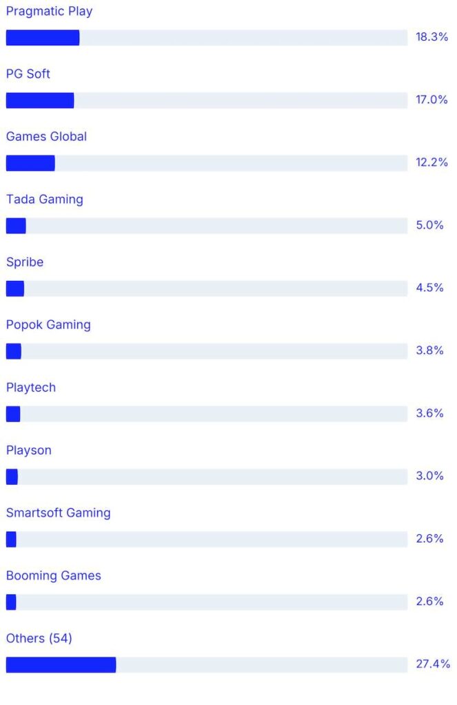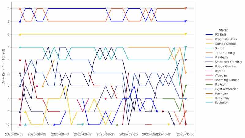 - Pragmatic Play end up back in 1st place, overtaking PG Soft on 5 October, driven by expanded operator coverage and strong performance from Tigre Sortudo.