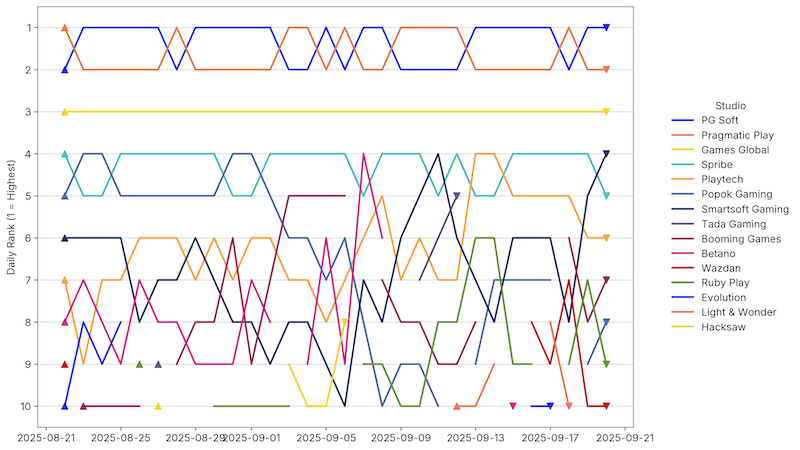 - Smartsoft Gaming surged from 8th to 4th, a remarkable +4 ranking rise through September, driven a great JetX performance.