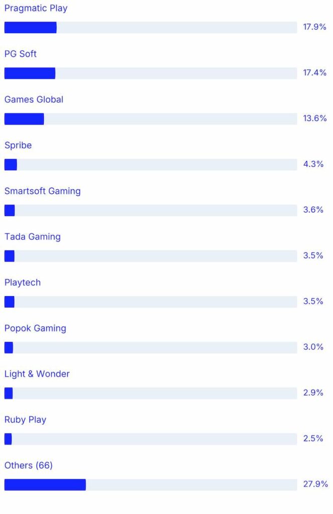 PG Soft keep top spot with 4 of the top 5 games in out chart (all Fortune titles). In terms of individual game performance they are the best of the rest after all conquering Aviator.