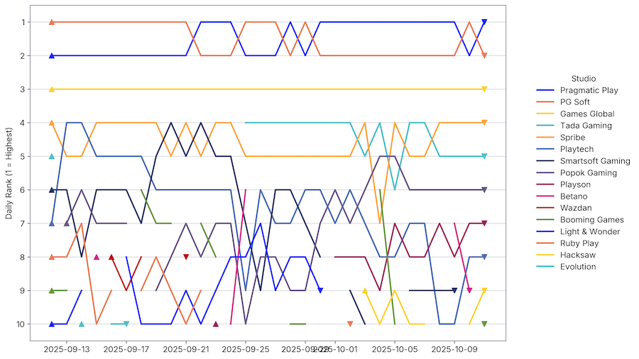 This week’s iGaming studio rankings showcase some dynamic shifts, particularly among the top contenders. Here’s a concise overview of the latest movements.