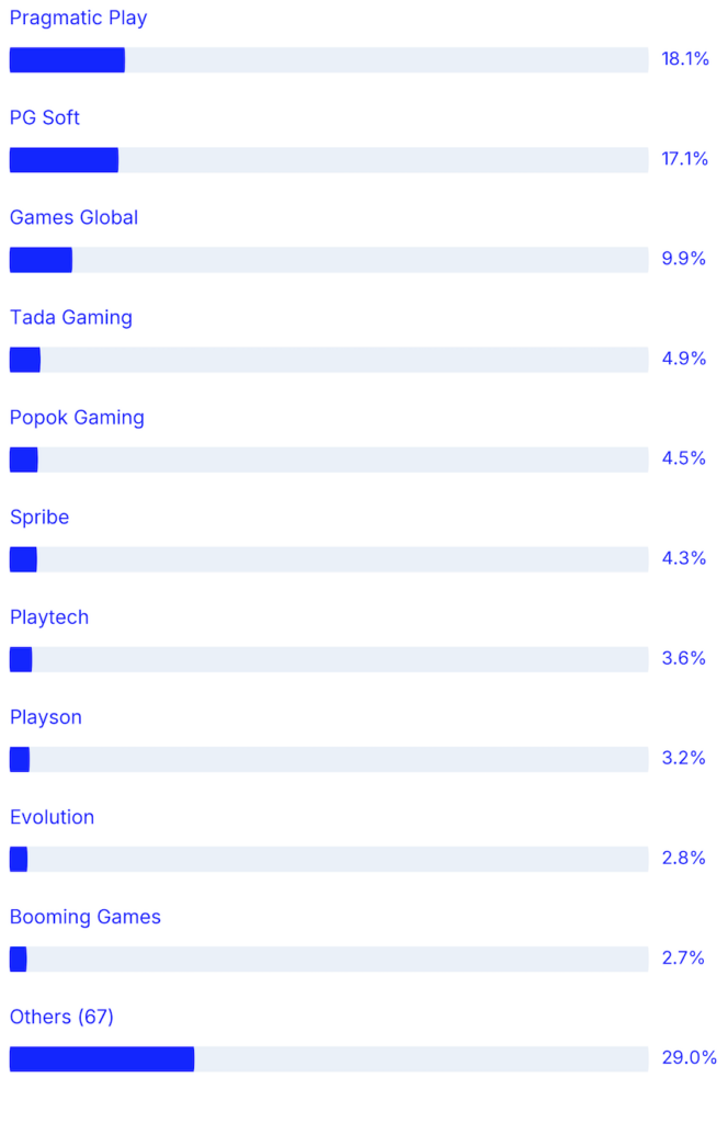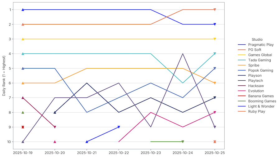 🔥 Pragmatic Play back on top – A week after losing out to PG Soft, they reclaim first place by the thinnest of margins, helped by their unmatched depth across brands (10 titles in the Top 20).