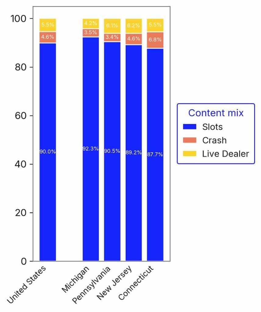 This chart shows the content positioning share between Crash Games, Slots and Live Dealer across the US and per tracked state. This is not the same as GGR split. We estimate that Live Dealer and Crash Game GGR share is substantially higher than shown here in GGR.